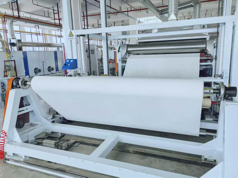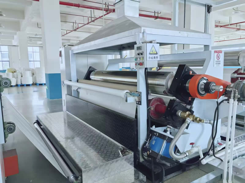 工艺流程:中心放卷—储布—胶点上胶—辊压或烘干—高温覆膜—常温覆膜—储布—中心收卷;